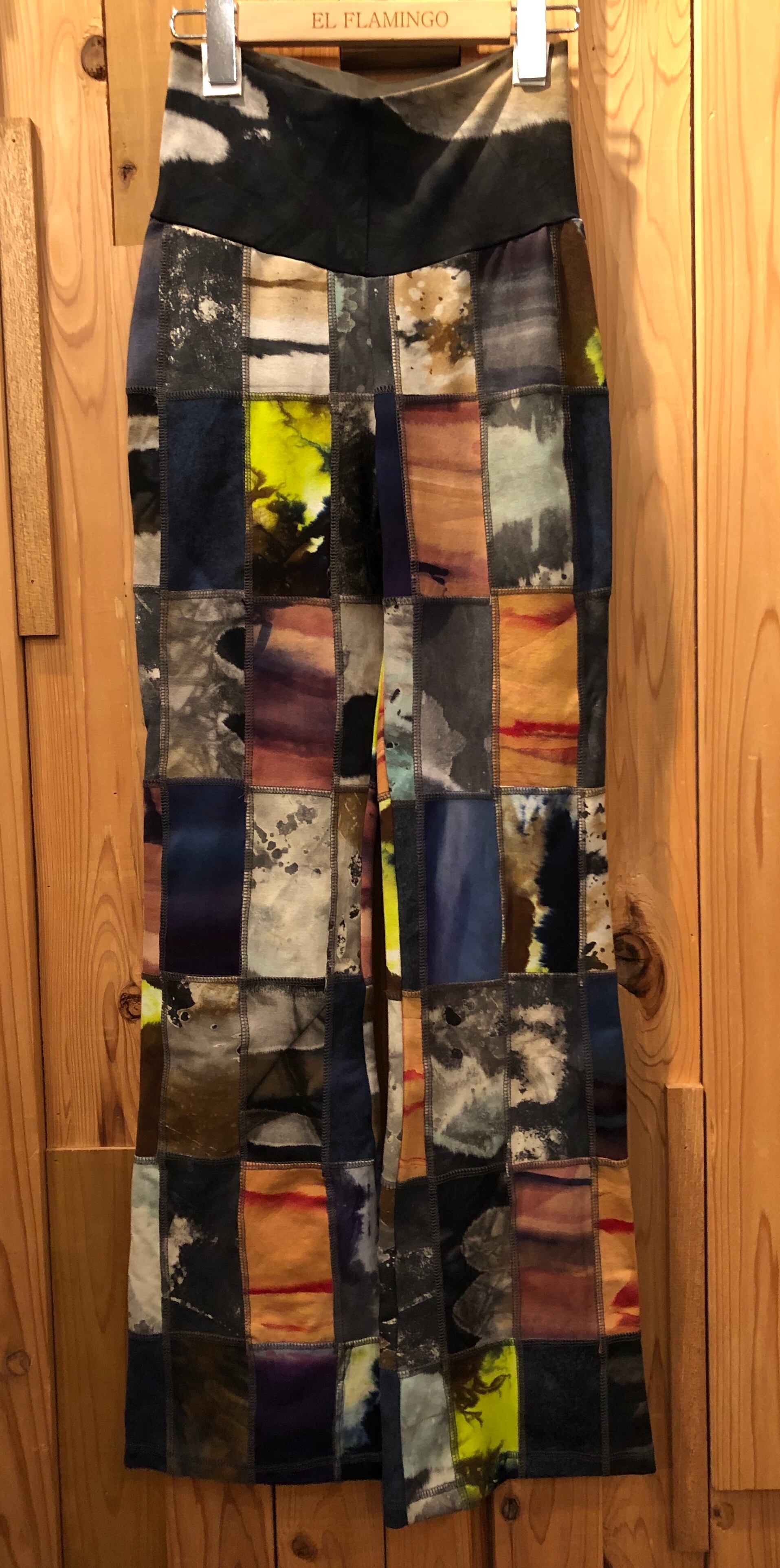 スーパーストレッチ素材、ライクラを染め上げてからパッチワークした美脚パンツです。